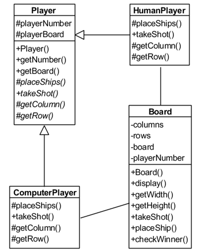 Using the following UML class diagram and class descriptions to help you, create a version of Sinking Ships. The game must have one human player, and one player controlled by the computer (the computer player can be made to target random tiles). The player should be able to choose how many rows (between 10 and 26) and how many columns (between 10 and 26) the game boards should have. Players cannot shoot tiles that they have already shot, and before the human player takes their shot, they should have the option to look at their own board (showing the location of their ships and the tiles that the computer player has taken shots at and whether those shots hit or missed) or the opponent’s board (showing the tiles that the human player has taken shots at, and whether those shots hit or missed, but not showing the location of the opponent’s ships). Player input should be given as a number, to indicate the column of their chosen location, and a letter, to indicate the row (first row is A, second row is B, etc.). You may use the Sinking Ships skeleton code to help you.
