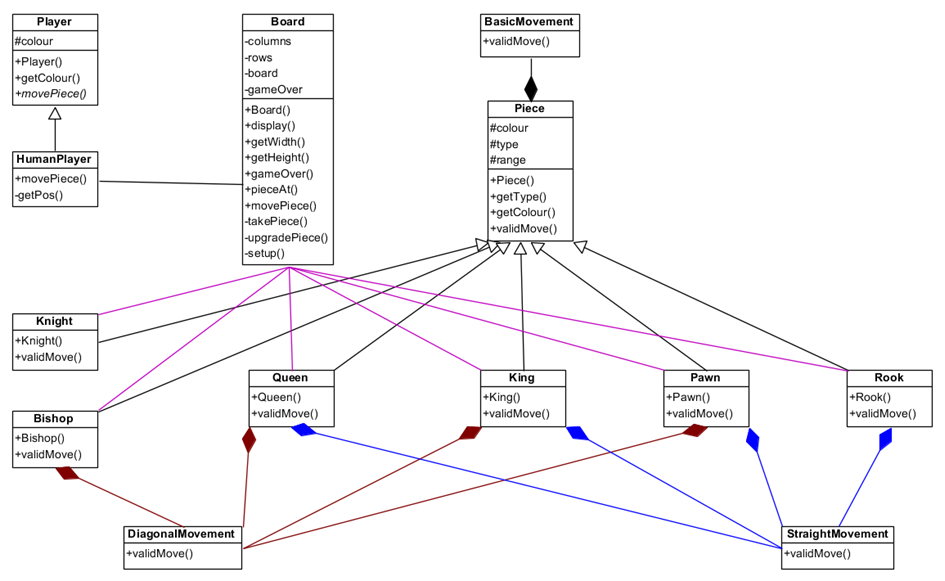Using the following UML class diagram and class descriptions to help you, create a version of Chess. When it is a player’s turn, they must select the tile with the piece that they would like to move (if this tile doesn’t contain one of their pieces, a message should be displayed to tell the player that they don’t have a piece on that tile and they should be asked for their selection again) and then select the tile that they would like to move this piece to (if this is not a valid move, a message should be displayed to tell the player that this move is invalid and they should be asked for their move again). Player input should be given as a number, to indicate the column of their chosen location, and a letter, to indicate the row (first row is A, second row is B, etc.). You may use the Chess skeleton code to help you.